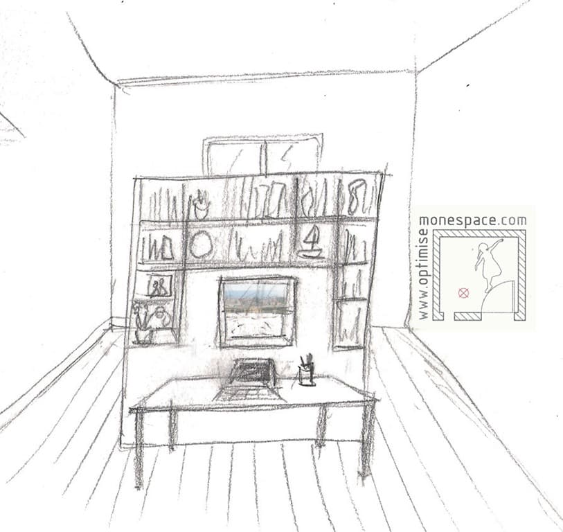 Génial, non ? Une bibliothèque qui servirait de séparation, tête de lit d’un côté, bureau de l’autre … avec percée vers la mer depuis le bureau !