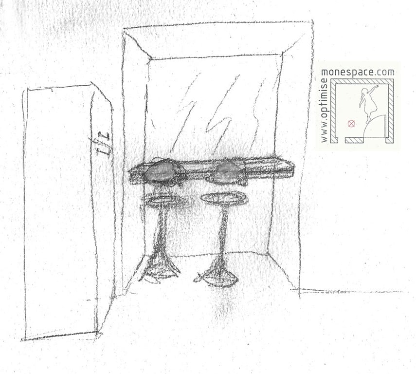 Cependant, on offre la possibilité de manger rapidement dans la cuisine, pour éviter les allers-retours au quotidien, grâce à un plan snack que l’on peut installer en “rognant” légèrement sur la chambre située derrière la cuisine.