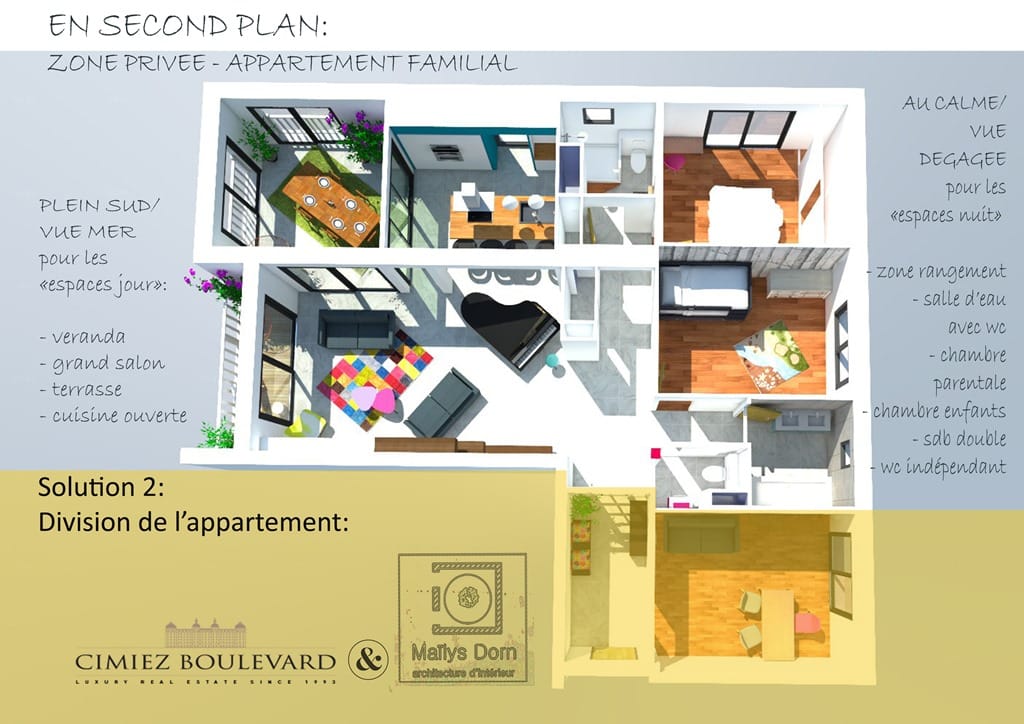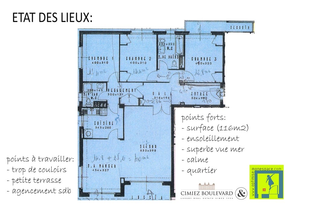 Certes, les vieux meubles, les tapisseries anciennes, ne sont plus au goût du jour. La cuisine n’est ni conviviale, ni pratique, et les salles-de-bain sont inconfortables. L’appartement, équipé de 3 chambres et 2 salles-de-bain, n’a aucun dressing, aucun wc indépendant. Mais deux critères repoussent par-dessus tout les visiteurs, et leur font oublier le potentiel inestimable de ce bien: la surface, sous exploitée, avec un hall d’entrée et des dégagements qui représentent à eux seuls 15% des m2 à la vente; et surtout, surtout, pour un appartement aussi grand, et disposant d’une superbe vue mer: l’absence d’une vraie terrasse, sur laquelle imaginer de joyeux repas surplombant la ville…
