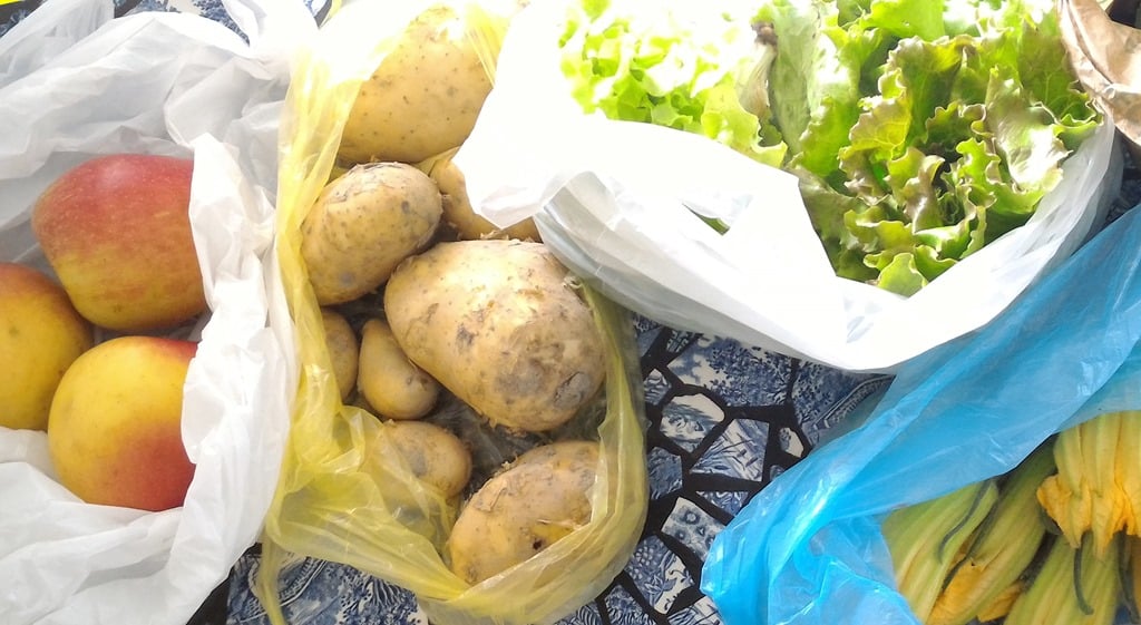 … Et là, c’est le drame. Pour chaque produit acheté, un nouveau sac plastique. Seul le marchand d’œufs propose, et même demande, de rapporter les boîtes en carton d’une semaine à l’autre. Pour tous les autres, c’est devenu quelque chose d’absolument normal : On se sert dans un panier, on fait la pesée légume par légume, et on met chaque sorte de fruits, chaque sorte de légumes, dans un sac en plastique différent. Résultat : je reviens à la maison encore une fois complètement envahie.